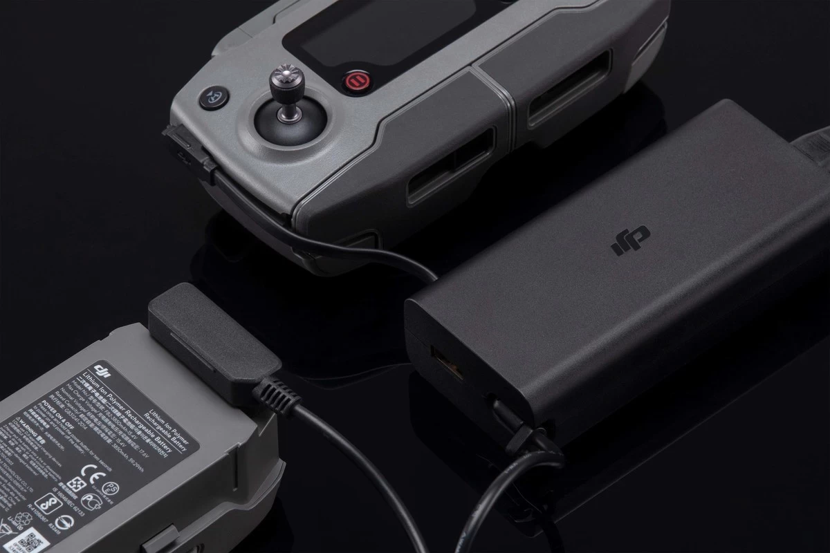 The Mavic 2 Battery Charger has multiple output modes including 17.6V and 5V. Equipped with a charging port, USB-A interface, and micro USB interface, the Battery Charger can charge batteries and the remote controller at the same time, as well as serving as an external power source for other devices.
