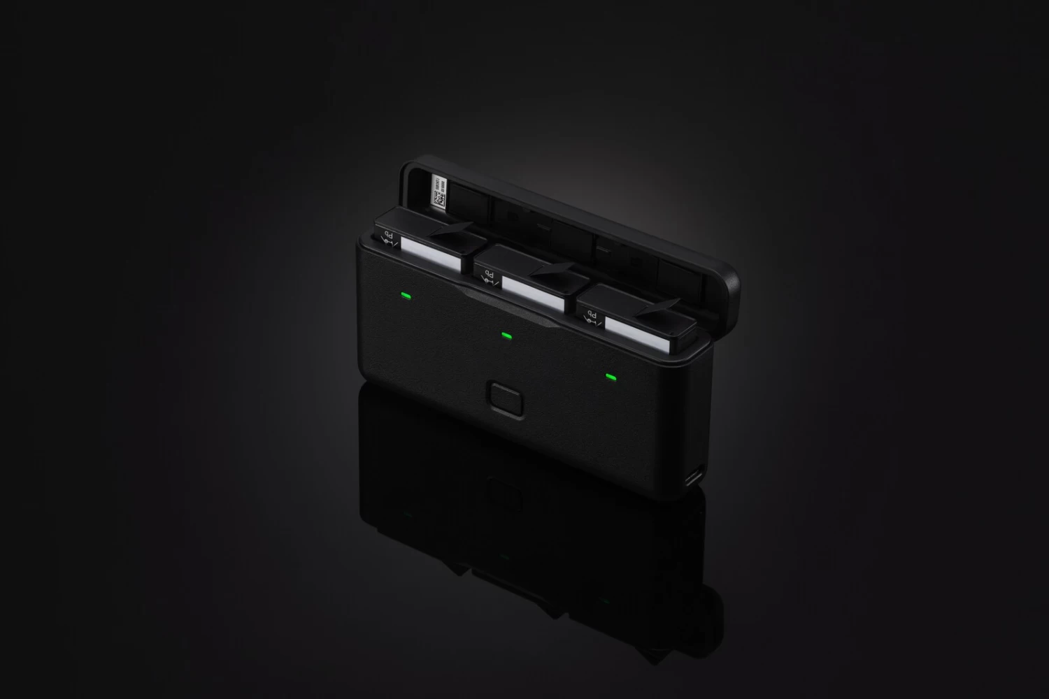 Stores three batteries and two microSD cards. Intelligently fast charges three batteries, and can be used together with batteries as a power bank.