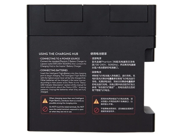 Small and easy to carry, the Phantom 3 Battery Charging Hub enables you to charge up to four Phantom 3 Intelligent Batteries together. The charging hub will automatically select the battery with the highest amount of remaining power, and charge it until full before moving on to the next battery. The entire process is monitored and each battery’s status is shown using LED indicators, making the charging process simple and easy.