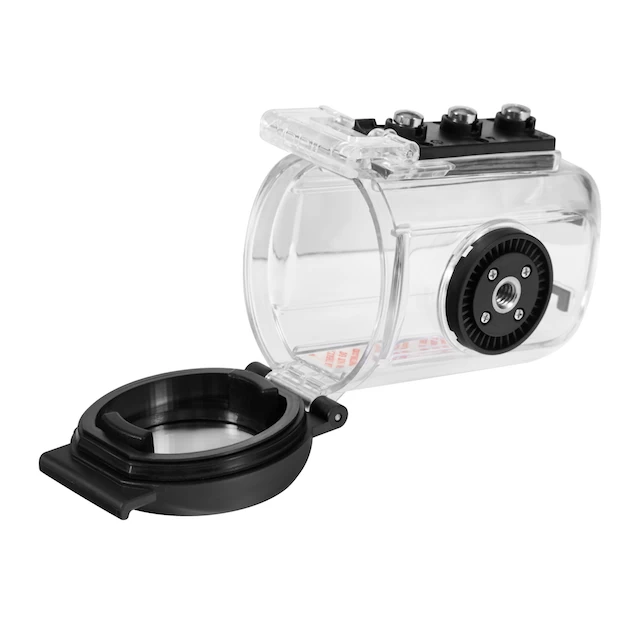 The waterproof case is capable of reaching depts of 40m (131ft). The case retains view of the screen, full button control and mounting system. Please note: the case is not compatible with the long life battery.