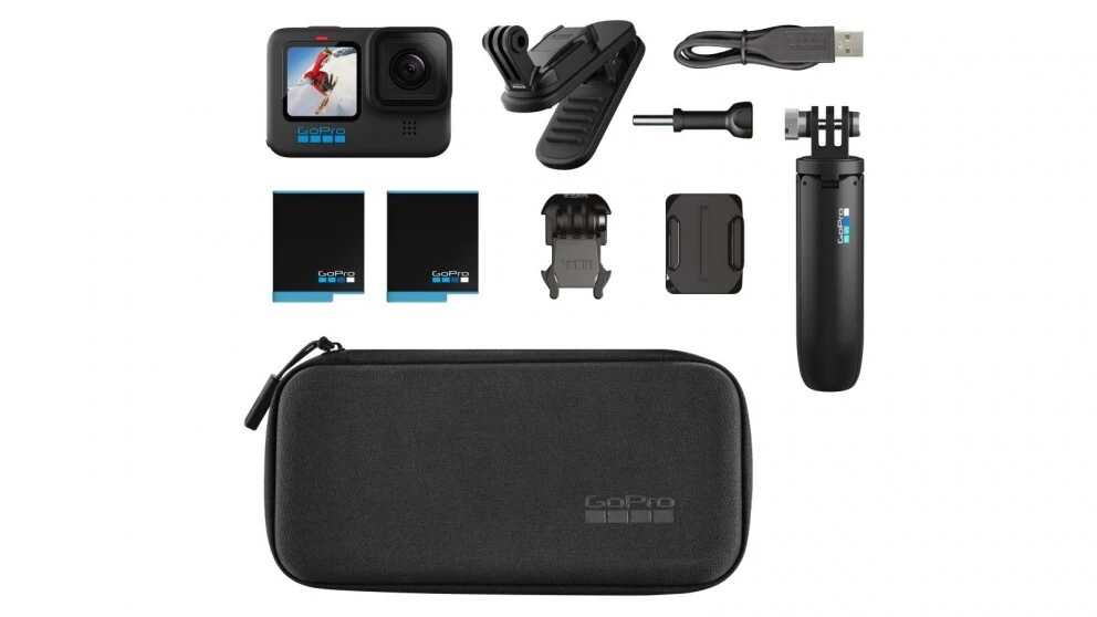 - Includes HERO10 Black camera, carrying case, rechargeable battery, curved adhesive mounts, mounting buckle + thumb screw and USB-C cable