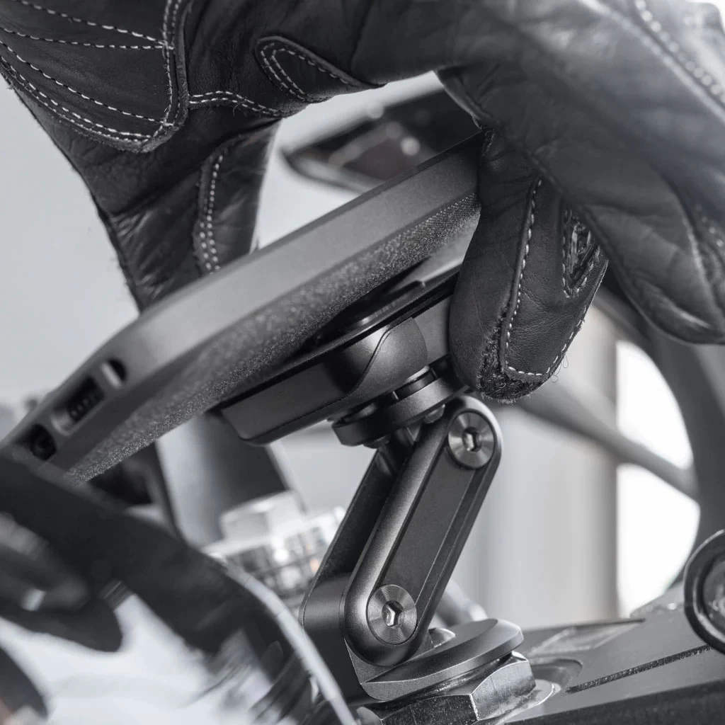 Ideal for sport and street bikes with clip-on style handlebars, the low-profile Motorcycle Stem Mount keeps your phone rigidly mounted, easily viewable, and instantly accessible. Securely installs in most hollow-center steering stem nuts using an expansion plug. Features an ultra-strong magnetic/mechanical mounting technology (called SlimLink) that grabs and locks your phone so effortlessly, it feels like magic.