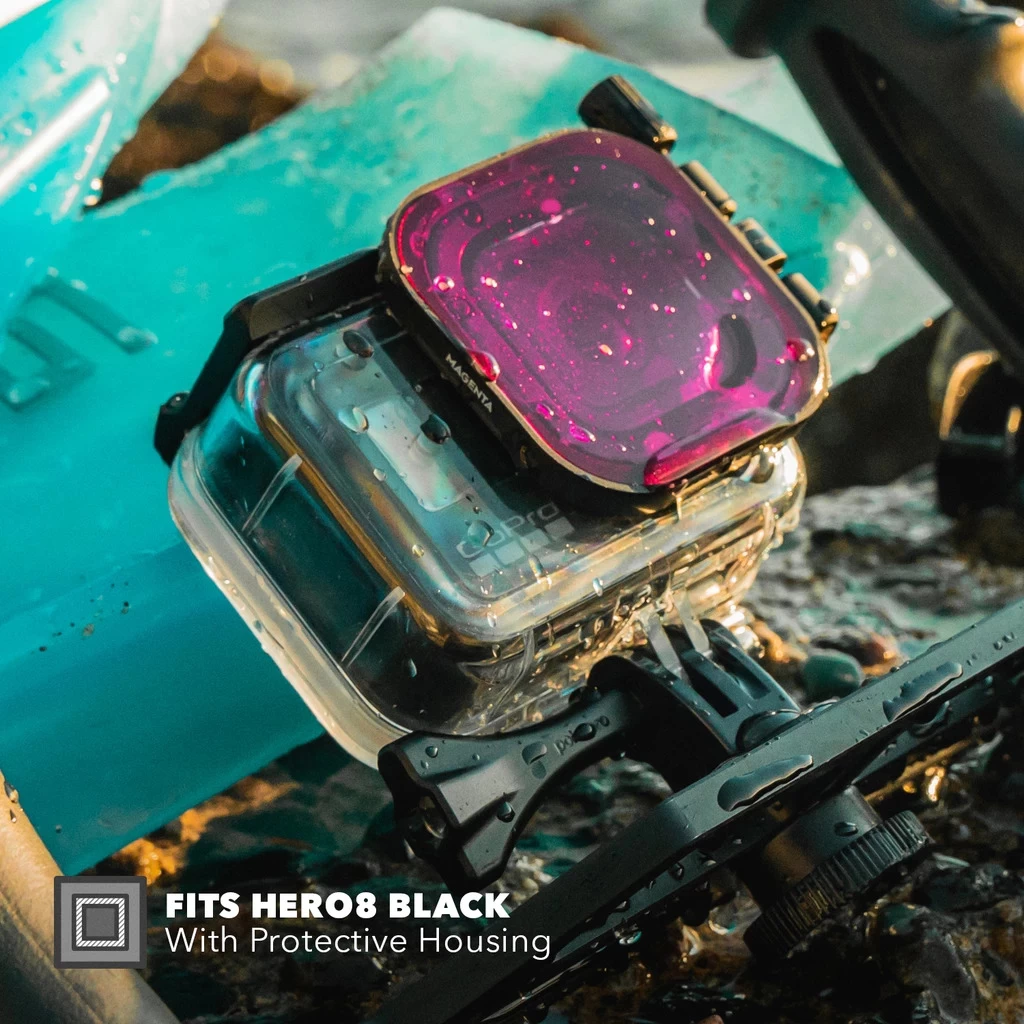 The DiveMaster 3-Pack Filter Kit for the GoPro HERO8 Black delivers vibrant colors throughout your photos and videos when diving in blue, green, or shallow waters. Quickly and securely swap between red, magenta or snorkel filters; allowing you to capture precise color based on your dive location. This set features a snap-on design, with an integrated thumbscrew to ensure it stays safely on your camera throughout your diving adventures. Included is a minimalistic protective case to transport your filters to your next dive adventure.