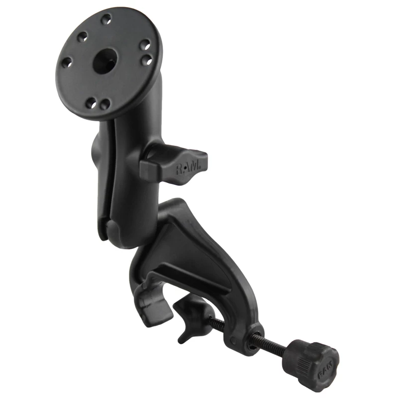 The RAM-B-121-202U consists of a yoke clamp base, standard length double socket arm and round 2.5″ base that contains the universal AMPs hole pattern. The yoke clamp base will fit rails in diameter from 0.625″ to a maximum of 1.25″. The 1″ rubber ball is at a right angle to the plane of the mount; when connected to a rail, the ball sits parallel to the rail. The mount is designed with a RAM 1″ diameter patented rubber ball and socket system that has adjustment points at both ends of the double socket arm, allowing for almost infinite adjustment and perfect viewing angles.