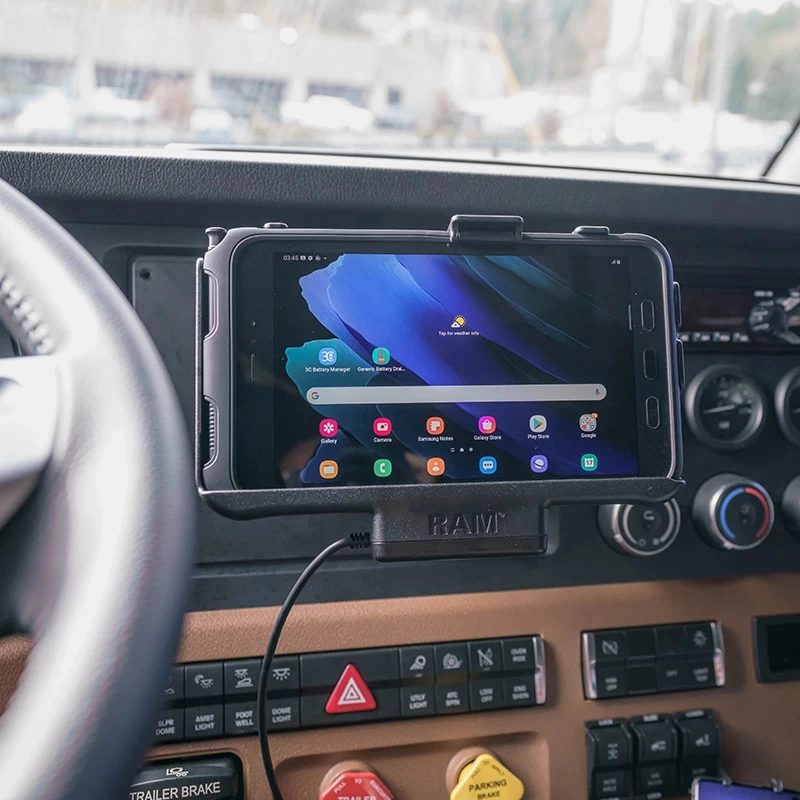 RAM® Mounts has partnered with Samsung to develop a powered cradle for the Samsung Galaxy Tab Active3 and Tab Active2. Compatible with the Samsung OEM case as well as the RAM® Skin™, this cradle has been designed to meet the demands of field workers in a variety of applications including transportation, field sales, logistics, manufacturing, and much more. This ultra-low cost cradle provides power to the device through the pogo pin interface on the tablet and can be easily rotated for both portrait and landscape operation of the device. This complete mounting kit includes a 3” x 3” steel backing plate with #10-24 threaded holes, two 2.5” round ball plates, medium length double socket arm, and a GDS® modular hardwire charger – an ideal solution for providing power to the Galaxy Tab Active3 and Tab Active2.