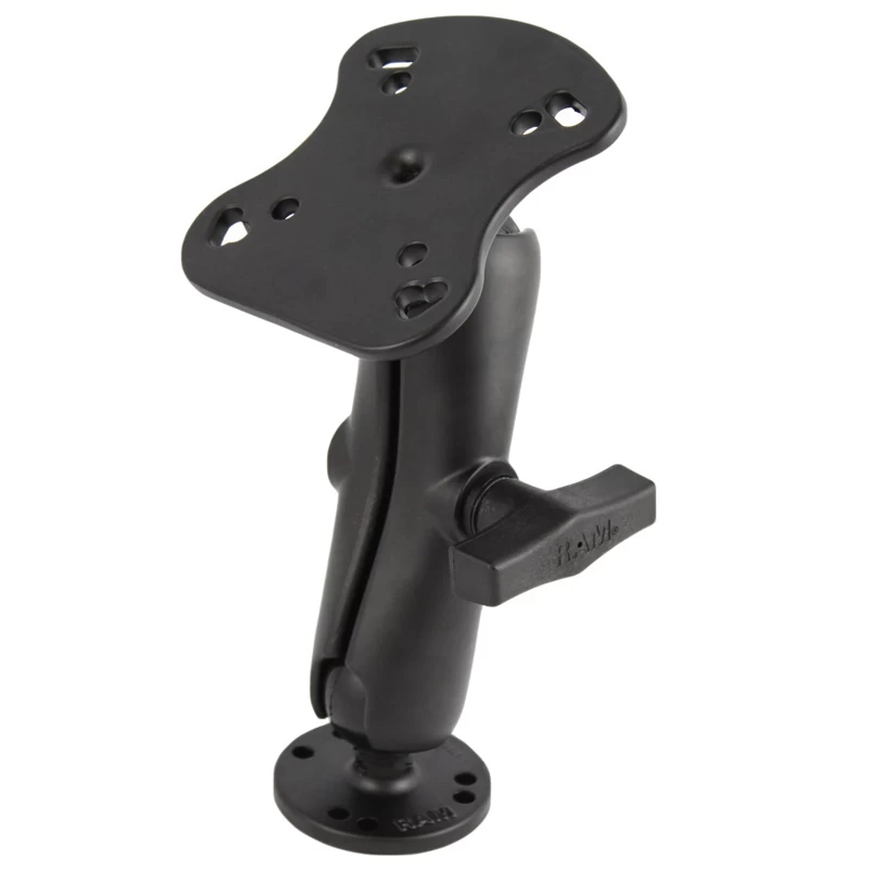 The RAM-107U consists of a double socket arm, 2.5″ diameter round base with the universal AMPS hole pattern and connecting Humminbird/Apelco marine adapter base. The mount is designed with a RAM 1.5″ diameter patented rubber ball and socket system that has adjustment points at both ends of the double socket arm; thus allowing for almost infinite adjustment and perfect viewing angles. Rubber ball and socket technology allows for almost infinite adjustment and perfect viewing angles.