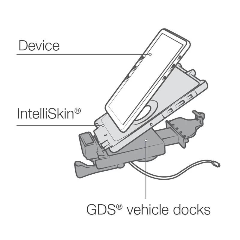 - Vehicle dock with integrated GDS® Technology™ offers a universal charging platform for any device wrapped in IntelliSkin® Next Gen