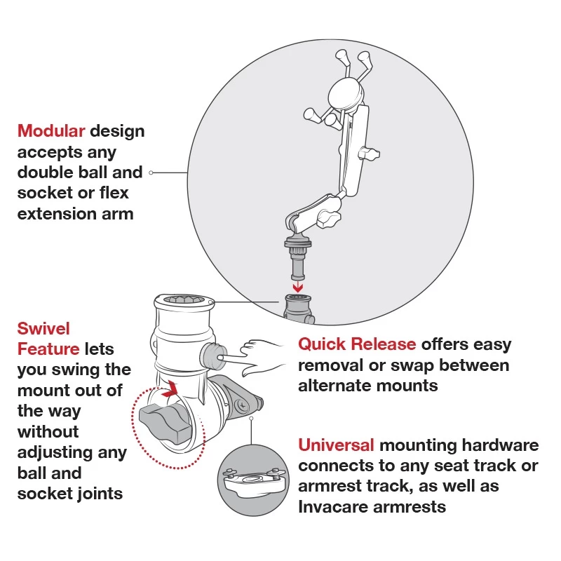 The RAM® Phone Mount with Quick Release & Swivel is the perfect solution for mounting virtually any phone to a wheelchair armrest track or Invacare armrest. The system consists of the RAM® X-Grip® phone holder, double ball & socket extension arms, ball post adapter, and the RAM® Universal Wheelchair Base. The universal base offers a quick disconnect feature of the entire mount without having to adjust any ball and socket components. The base also features an adjustable knob that lets you swivel the mount in and out of position with ease. The compact design of the RAM® Universal Wheelchair mounting system stays within the chair’s armrest width, offering peace of mind when navigating through tight spaces and doorways. All RAM® mounting compontents are backed by a lifetime warranty.