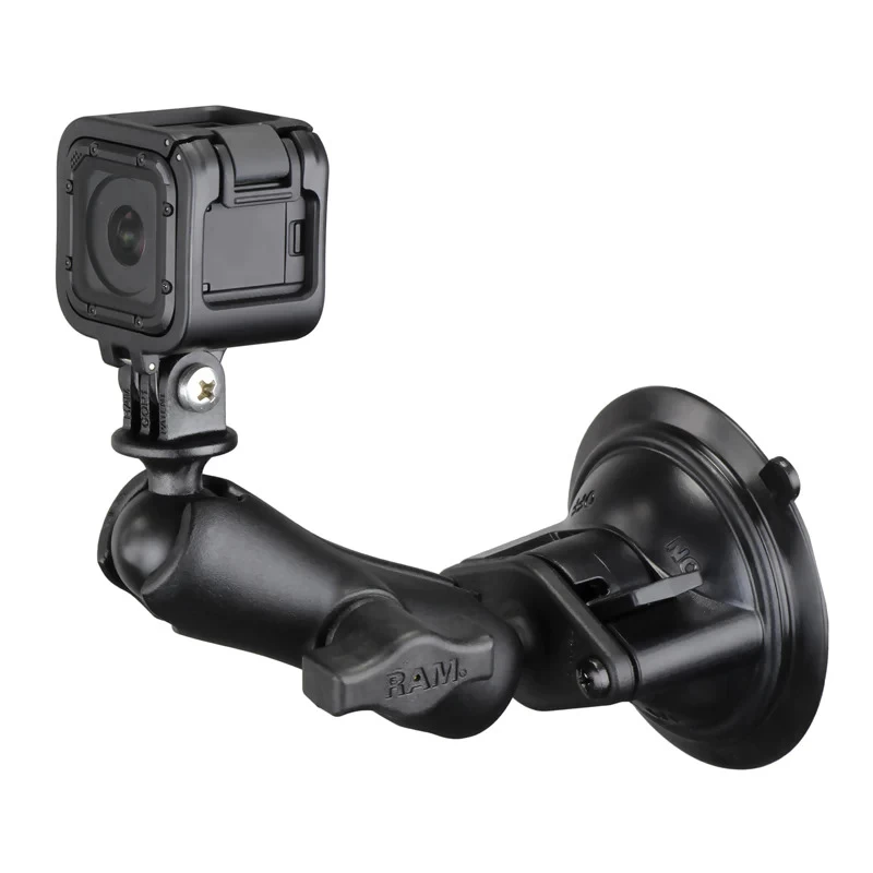 The RAM-B-166-GOP1U consists of a 3.3″ diameter suction cup twist lock base, STANDARD length double socket arm and 1″ diameter ball with custom GoPro® Hero adapter. The mount is designed with a RAM 1″ diameter patented rubber ball and socket system that has adjustment points at both ends of the double socket arm; this allowing for almost infinite adjustment and perfect viewing angles. The suction cup, twist lock base is designed to have a strong hold on glass and non-porous plastic surfaces, including adhesive disks. The GoPro® Hero adapter attaches directly to the underside of the camera, replacing the factory mounting bracket.