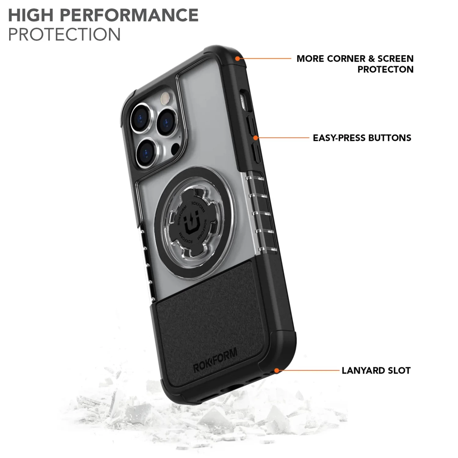 The integrated RokLock® mount allows for fast and secure mounting on bikes, motorcycles, cars, and more. The all-new iPhone 14 Pro Max Crystal series case provides 360-degree military-grade drop protection, tough Crystal-clear polycarbonate to show off the color of your new iPhone®, and a slim feel that easily slides in and out of your pocket.
