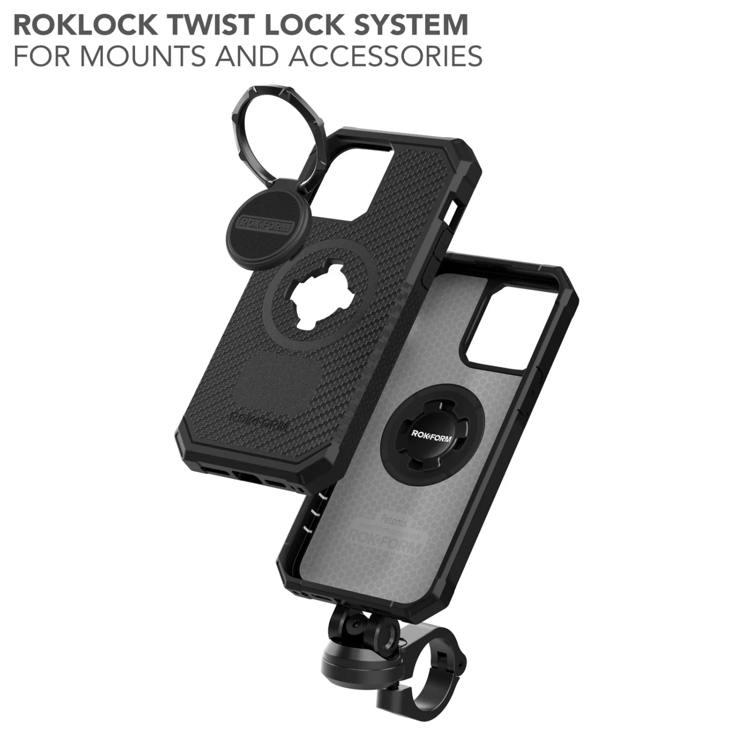 The integrated RokLock® mount allows for fast and secure mounting on bikes, motorcycles, cars, and more. Combine all that with 360-degree military-grade drop protection and a slim feel that easily slides in and out of your pocket to have ROKFORM’s top-of-the-line Rugged case.