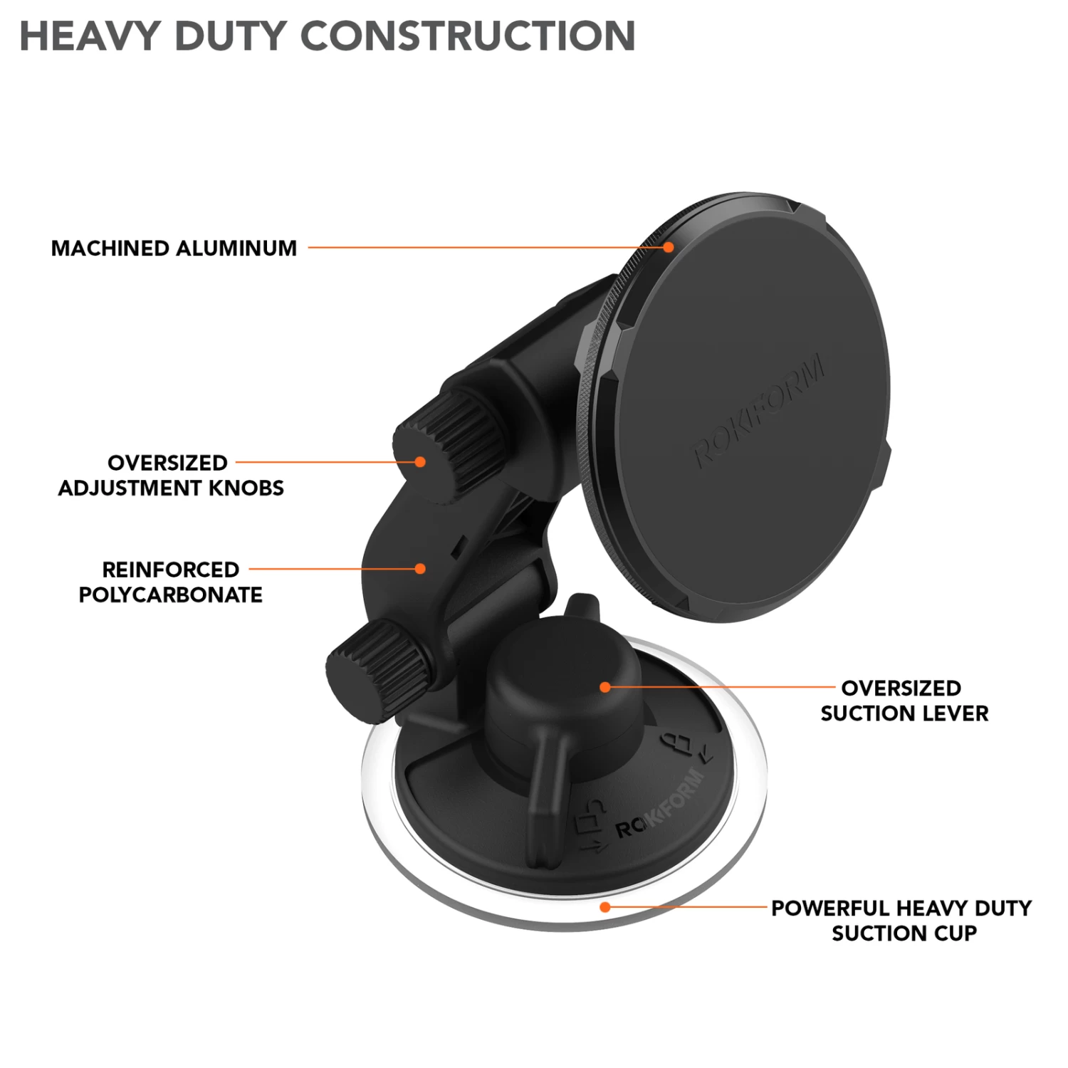 The new ROKFORM Magnetic Windshield Suction Mount is designed to securely hold your phone on windshields, desktops, toolboxes, refrigerators, and more for the ultimate handsfree experience. The heavy-duty suction mount and reinforced polycarbonate construction holds securely and won’t vibrate while on the road like lesser mounts can. The fully adjustable head features an array of MagSafe® compatible magnets along with a heavy-duty center magnet that works with all MagSafe® compatible phones & cases and all ROKFORM magnetic cases. If you are looking for an easy to use fully adjustable, secure magnetic suction mount for your phone, look no further than the ROKFORM Magnetic Windshield Suction Mount.