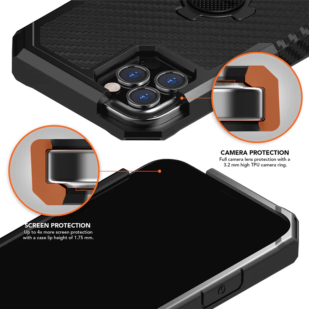 Our best-selling RUGGED case just got even better for the new Apple® iPhone 12/12 Pro. Our new iPhone 12/12 Pro case has even more screen, corner, and camera protection without adding bulk, so it still feels slim and fits easily in your pocket, but you don’t have to worry about drops of up to 6 feet! We have also increased the magnet size and force for even more holding power at the gym, on your fridge, toolbox, and even the golf course. Now included in each of our iPhone 12/12 Pro Rugged cases for the iPhone is our Magnetic RokLock Plug for extra hold and perfectly balanced landscape and portrait mounting on our Vent Mount, Swivel mount, and Low Pro car mounts, allowing for easy reading of your maps, GPS and incoming calls. The integrated ROKLOCK® twist-lock lets you indulge in effortless, secure mounting of your phone to bicycles, cars, motorcycles, and more. The scratch-resistant carbon fiber texture and anti-slip grip mean your phone case will always look great, and you won’t have to worry about it sliding around. Like all ROKFORM cases, a lanyard slot comes standard and will work with almost any lanyard for extra security and drops prevention.