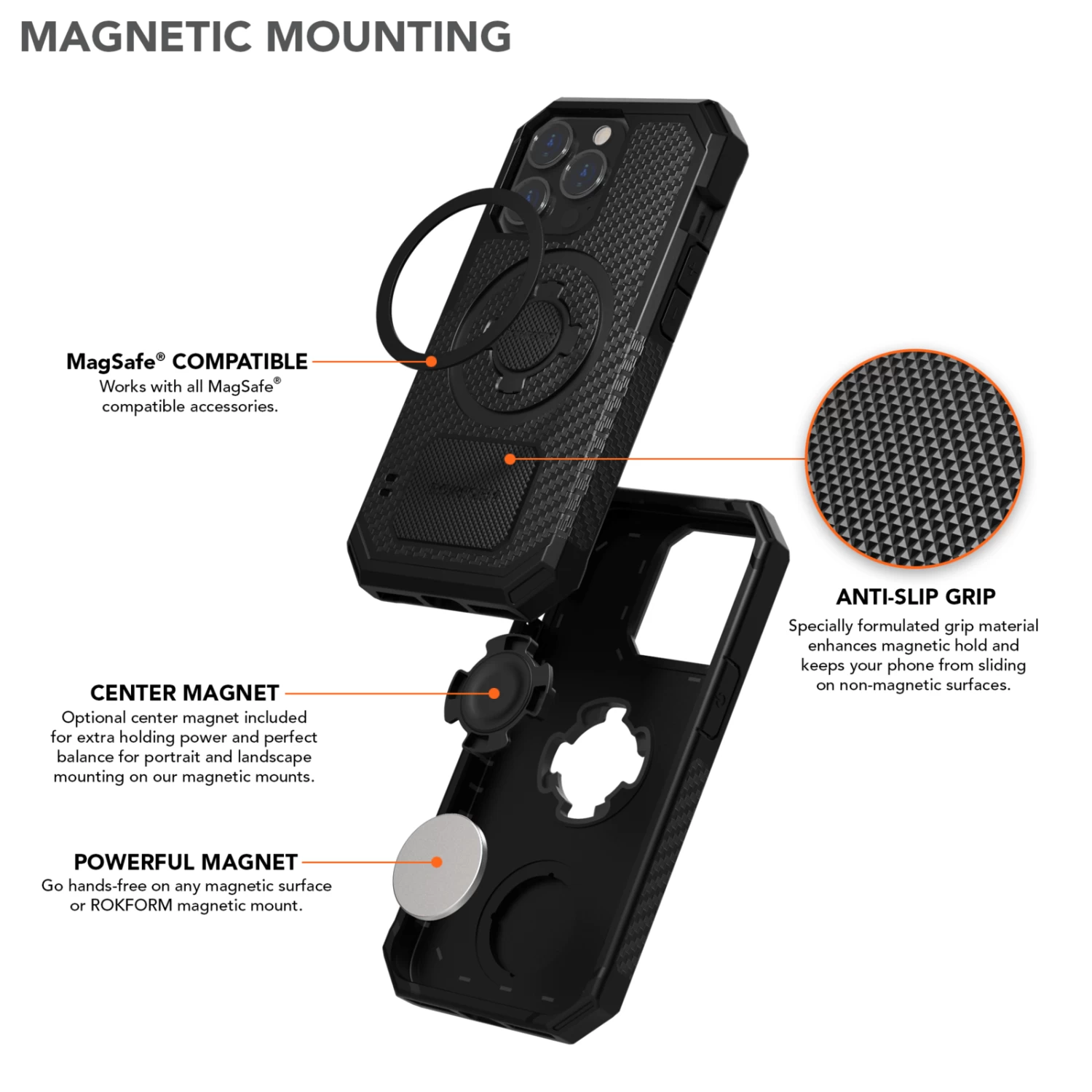 Get perfectly balanced mounting in portrait or landscape when using any of our magnetic mounts – Super Grip Vent Mount, Swivel Mount, Low-Pro Magnetic Mount, and now any MagSafe® compatible mount or accessory. All of this is thanks to 3 strategically placed magnetic areas built right into the case.