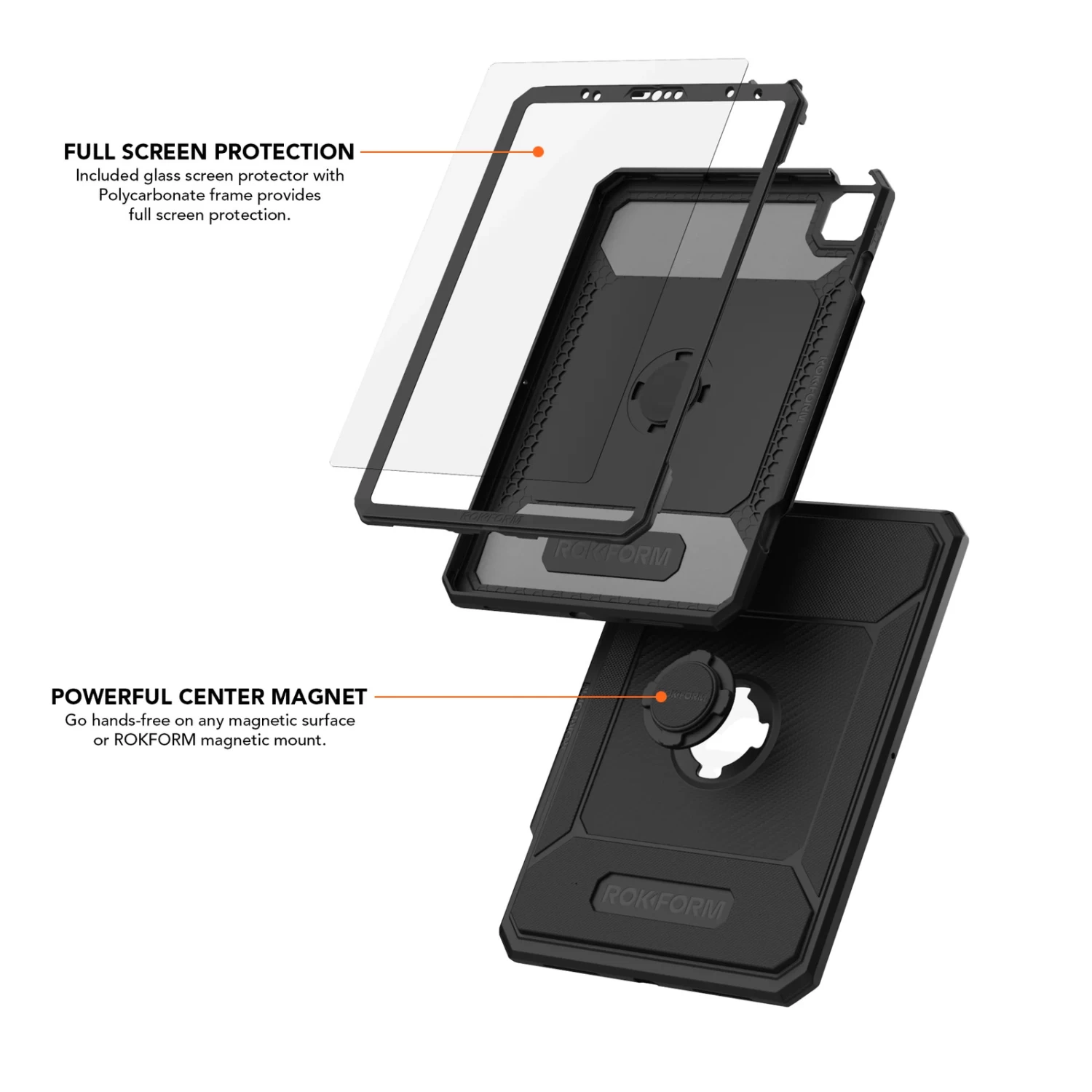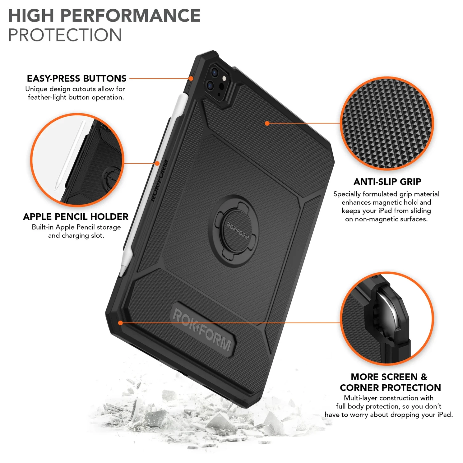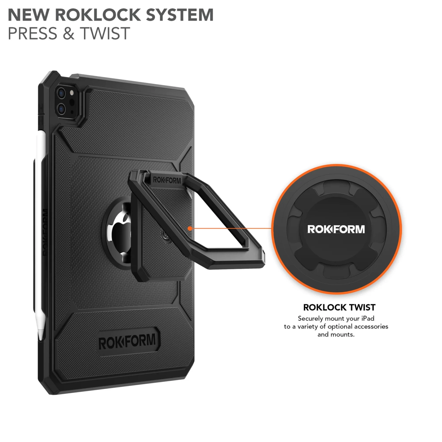 ALL NEW iPad Rugged CaseThe ROKFORM Rugged Series iPad case is a powerhouse of functionality and protection. Designed in tandem with feedback from our Police, Fire, Military, Construction, and Field services customers to work and perform under harsh conditions day after day. A secure and easy-to-use twist lock system allows for optional accessories like stands, hand straps, and universal mounts to make even the toughest jobs easier. Built-in magnets allow for instant, hands-free mounting on any magnetic surface and still allow for full iPad functionality, including the stylus.
