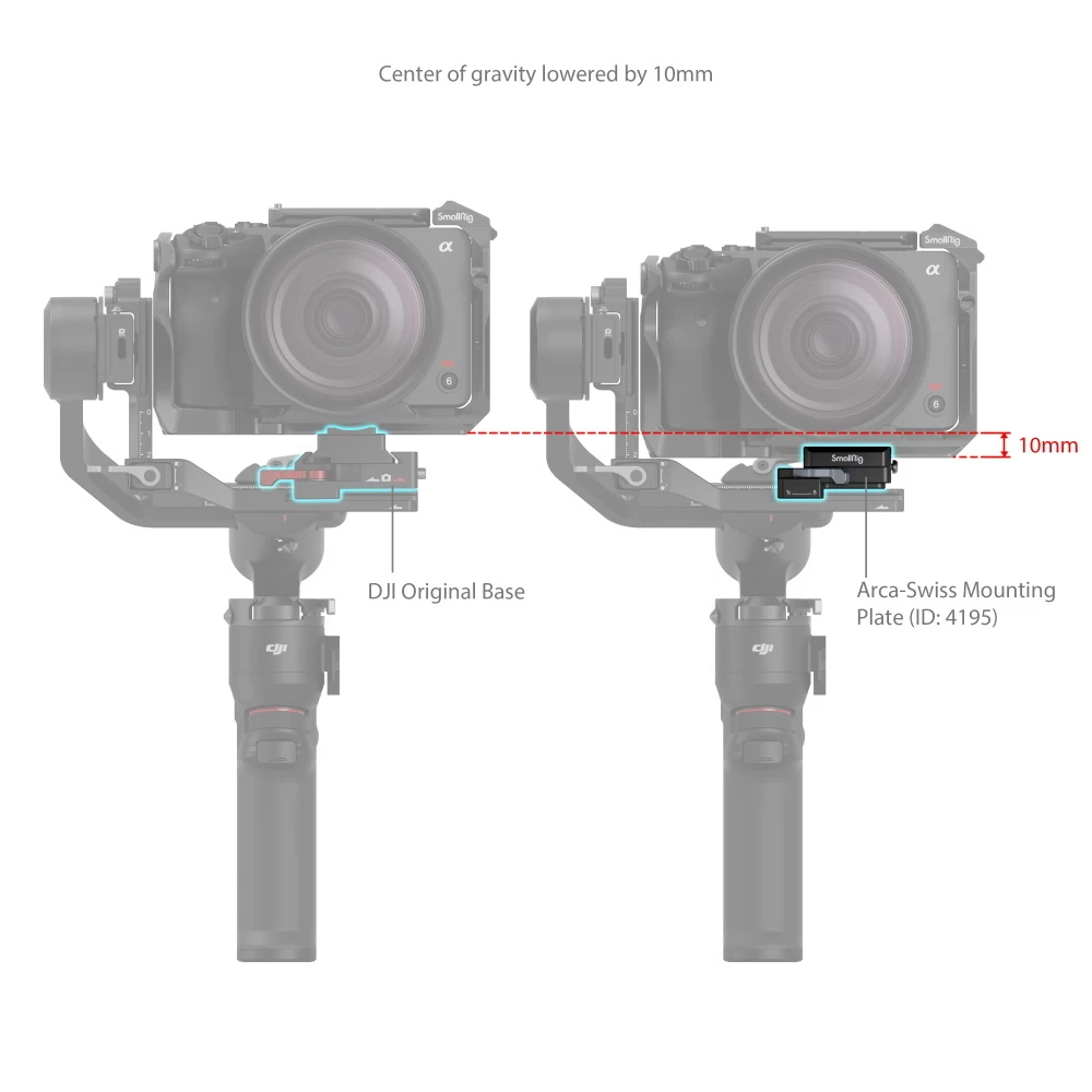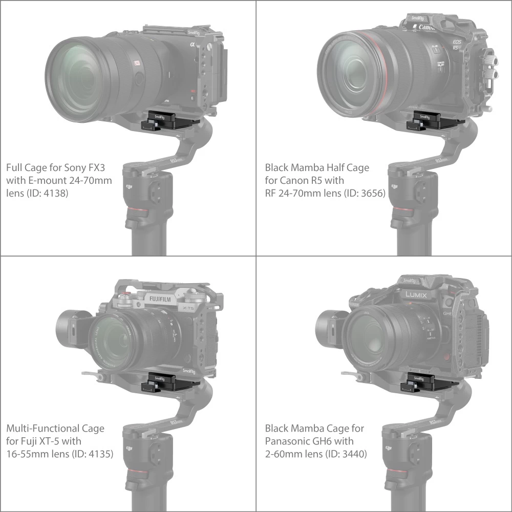 SmallRig Arca-Swiss Mount Plate for DJI RS 3 Mini 4195 is designed to support various other cameras, such as Sony FX3 with 24-70mm lens, Canon R5 with 24-70mm lens, FUJIFILM X-T5 with 16-55mm lens and LUMIX GH6 with 12-60mm lens. They can be mounted by sliding in from side or top. The rig also helps quickly switch between vertical and horizontal shooting.