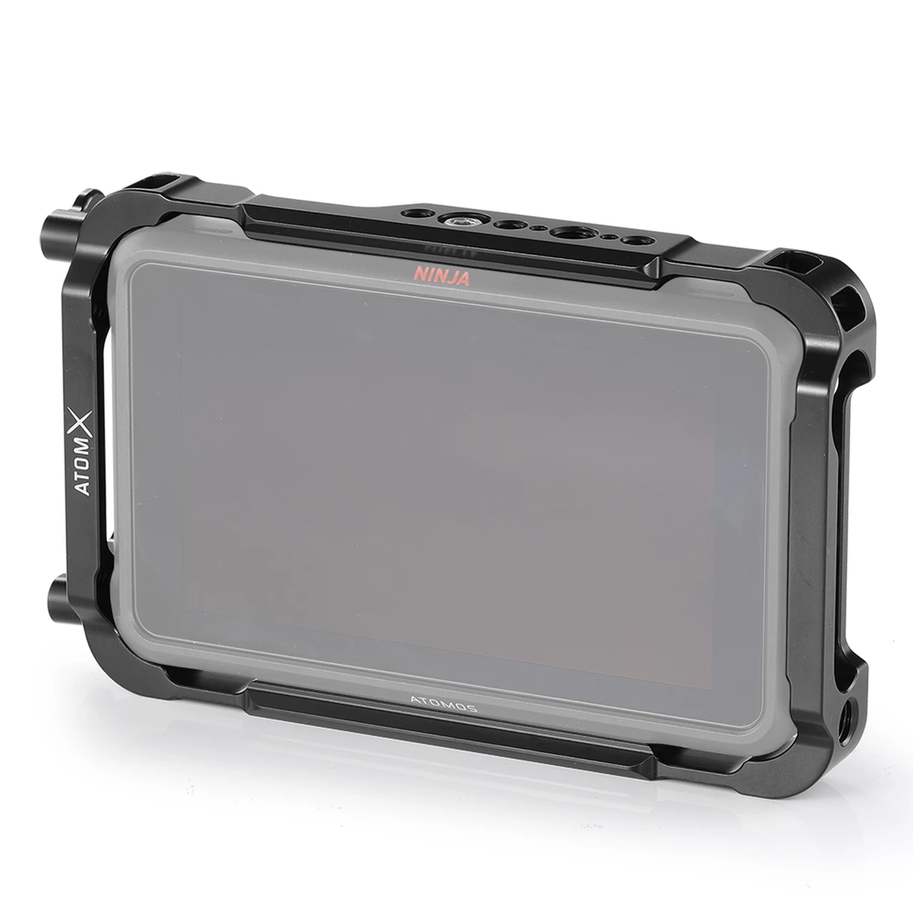 SmallRig Cage for Atomos Ninja V 2209 was co-designed with Atomos to provide an additional protective exoskeleton for the monitor, with a wide range of industry standard mount points. The cage mounts to the monitor by a 1/4’’-20 screw on the top and two M3 screws on the left side. Across the top and bottom the cage features multiple 1/4’’-20, 3/8’’-16 holes, and an ARRI locating mount point on the base. NATO rails are also provided along on both top and bottom to allow use with a range of SmallRig mounts such as SmallRig Ball Head Magic Arm 2071 or 2072 for quick release. The cage includes a single HDMI cable clamp that works with a range of cables and is ideal for the AtomFlex 4k 60p cables. If required, the cage supports the use of a second SmallRig HDMI Cable Clamp 1693 for the HDMI output. It is attached to the left to protect the HDMI cable and port. For backward compatibility with Atomos Master Caddy II, the cage also features Drive locks that incorporate the additional size of standard 2.5’’ drives into the cage’s form factor. It features raised attachment points on both the top and bottom of the cage for use with neck straps and to accommodate the Atomos Ninja V Sunhood frame.