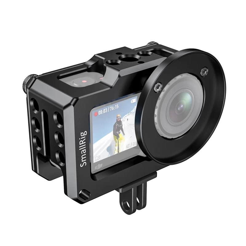 SmallRig Cage CVD2360 for DJI Osmo Action is designed to provide protection and mounting solutions for DJI Osmo Action camera. The cage secures on the camera via two thumbscrews and features hex spanner holes to re-tighten. It maintains all the access to screen, battery & card. The cage features an Arri 3/8″ locating hole on the top for Arri Top Handle 2165 and Magic Arm 2115. Multiple 1/4″-20 accessory threads are provided for Cold Shoe 1593, Magic Arm 2070 and mini tripod. The cage integrates a slot on the right side for carry strap. The bottom of the cage features two M3 threads which allows attachment to the original Osmo Action Mount Base. Additionally there is a 52mm diameter threaded mount for filters and wide angle lens attachments. Optional Cable Clamp 1693 is provided to protect the USB-C cable to protect the cable from accidental pulling.