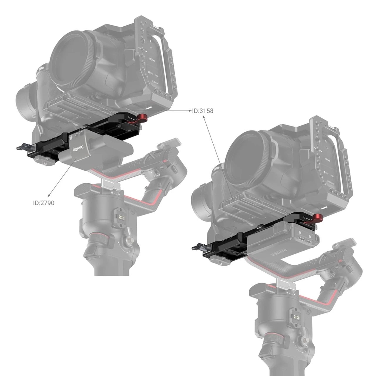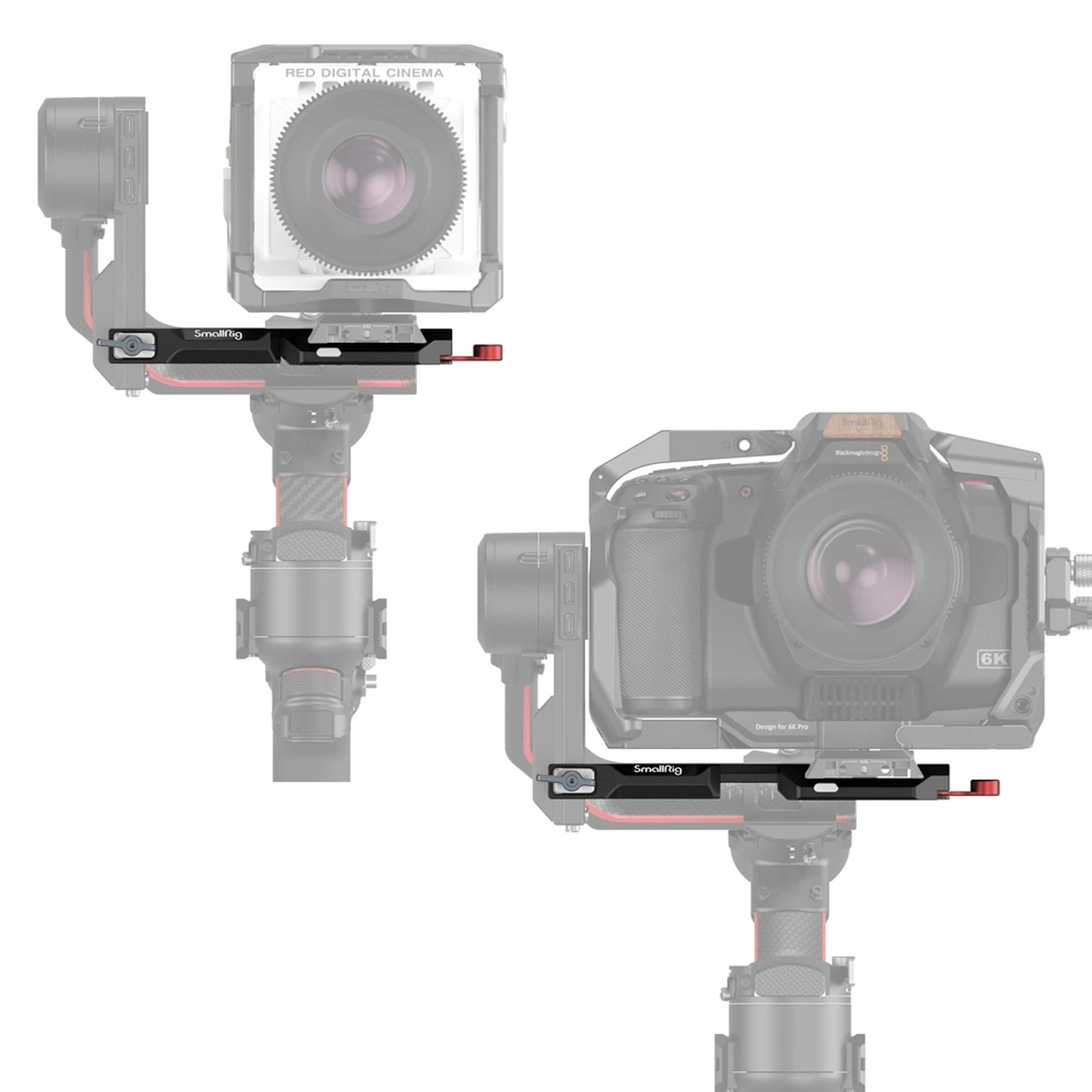 SmallRig mounting plate for DJI RS2 3249 is a stretchable baseplate designed for DJI RS2. It slides over the tilt arm to adjust the mounting position and is secured with a locking knob. It’s horizontally stretchable to fit large cameras such as BMPCC 6K Pro, by changing the distance between the RS2 tilt arm and the camera. You can also adjust the camera horizontally and fix it with a flip lock for quick leveling. The baseplate is compatible with the original Manfrotto quick release plates or 3061/3158/3031, and equipped with a quick locking structure and an anti-release structure for easy assembly and disassembly and to prevent accidental disconnection. It also supports the original RavenEye Image Transmission System and comes with multiple 1/4″ threaded holes for such accessories as 2336, 2987, and 2790 to facilitate power supply.