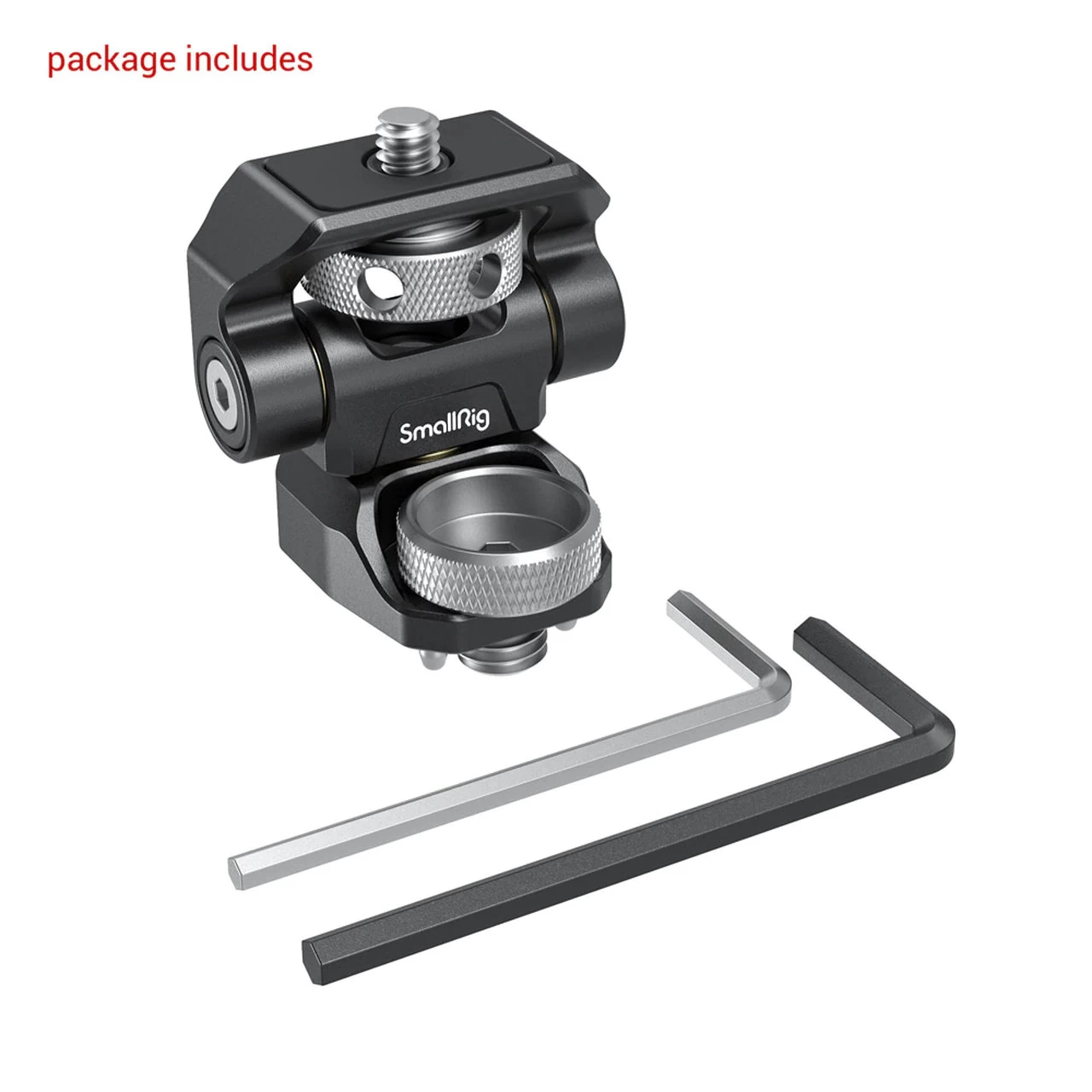 SmallRig Swivel and Tilt Adjustable Monitor Mount with ARRI-Style Mount 2903 is designed to hold your monitor onto the camera cage or other mounting system via ARRI 3/8”-16 style anti-twist mount. It features 1/4”-20 screw on the top for monitor, light, or microphone. The holder enables to swivel 360° sideways and tilts 170° with a free stop in any position. The tightness of each axis is adjustable via the Allen wrench. The robust mount is CNC-Machined Aluminum and can support 5” and 7” monitor up to 1.5kg. The swivel and tilt mount has protective rubber padding on top and includes an Allen wrench for tightening the mounts for further security. Besides, the bottom comes with a 1/4”-20 threaded hole for more DIY options.