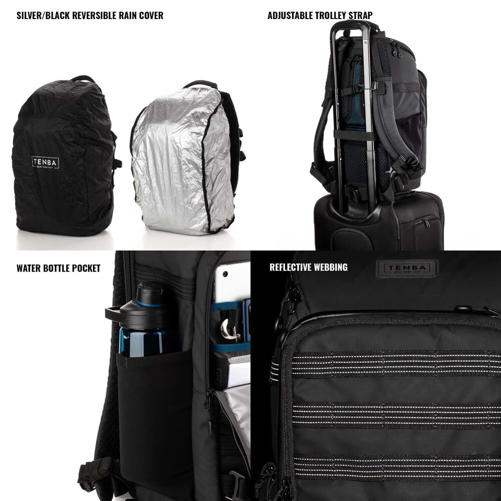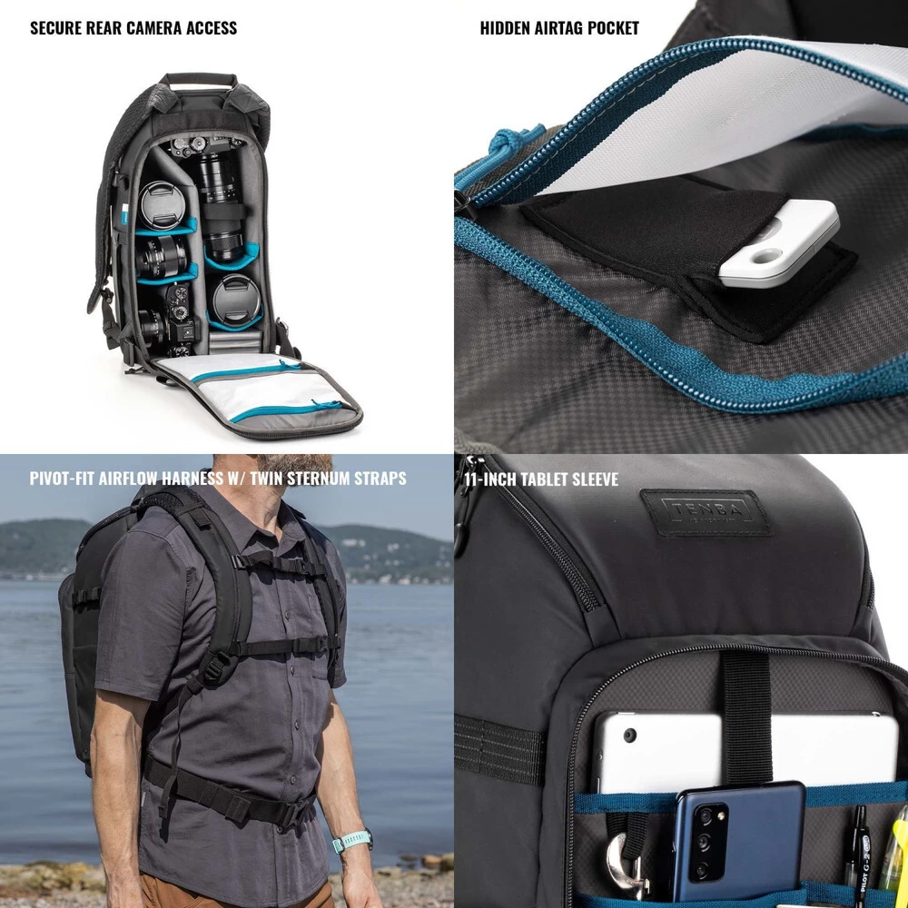 - Airflow Harness with Dual Sternum Straps – The Airflow harness combines ventilating 3D airmesh and Tenba’s Pivot-Fit™ auto-adjusting straps to ensure a comfortable fit. Unique dual sternum straps significantly improve the load balancing across the chest, with significant benefits for female and male customers alike. Bottom sternum strap can be removed if desired. Rear panel also includes a trolley strap for secure piggyback travel through airports.