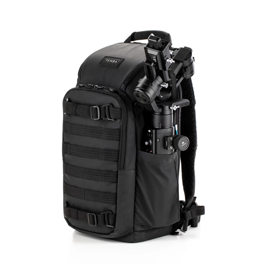 Tenba’s tactical Axis bags were inspired by the ultra-durable bags we’ve made for the military throughout our 40+ year history. The 16L backpack will fit 1-2 Mirrorless, DSLR or Cine cameras with 4-6 lenses, up to 300mm 2.8, plus a tablet up to 11 inches (28 cm) like the iPad Pro. It also fits a DJI Mavic and other compact drones. MOLLE webbing allows limitless expandability with Tenba Tools, such as Lens Capsules, Battery Pouches and Memory Card Wallets, as well as a multitude of military-standard pouches and accessories. Tenba’s Airflow harness and auto-adjusting Pivot-Fit Straps allow the pack to comfortably fit users of all sizes. This backpack features secure rear camera access, and it’s the first camera bag to include a hidden pocket compatible with an Apple AirTag or Tile Bluetooth Tracker.